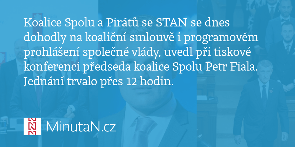 Budoucí vládní koalice se zavázala snížit schodek veřejných financí na tři procenta hrubého domácího produktu, chce zvýšit daňovou slevu na poplatníka či snížit sociální pojištění placené zaměstnavatelem... Vláda znovu přijímá opatření ve zmatku a nečekaně.. Koalice spolu a pirátů se stan se po dvanáctihodinovém jednání dohodly na koaliční smlouvě i programovém prohlášení společné vlády, uvedl petr fiala.